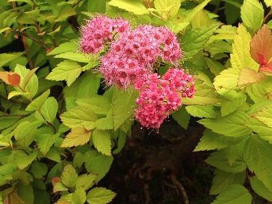 Цветы: карминово-розовые, мелкие, собранные в щитковидные соцветия, обильное цветение на второй-третий год, с конца июня до середины августа. Растение светолюбивое, но выносит и полутень, яркую окраску листья приобретают на солнечных участках, в тени они зеленеют.