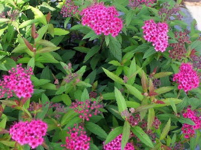 Описание Спирея японская (Бумальда) Антони Ватерер – это лиственный кустарник с шаровидной раскидистой кроной и яркими карминно-красными цветками.