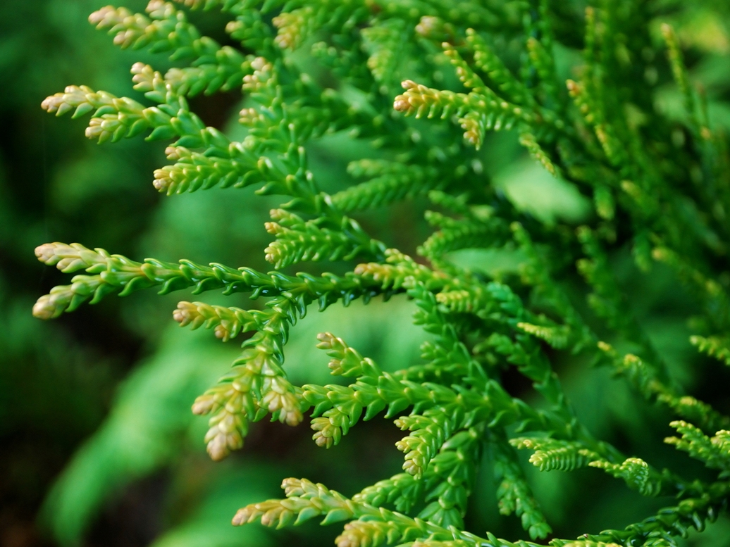 Хвойное деревце высотой до 1,5 м широкопирамидальной формы, хвоя чешуйчатая, чешуи крупные светло-зеленого цвета.